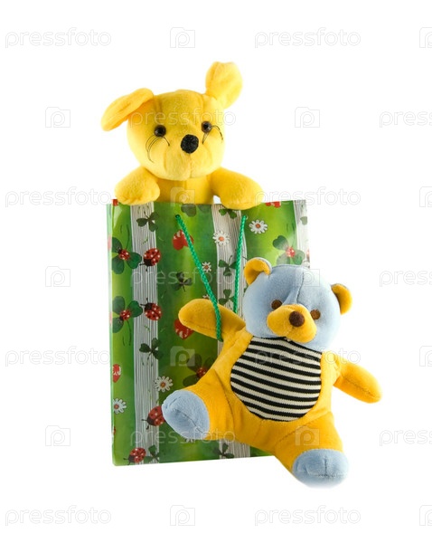 Игрушки в подарочном пакете на белом фоне