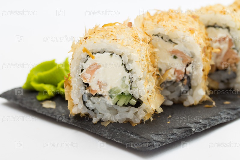 Суши-ролл на каменной тарелке, изолированные на белом фоне