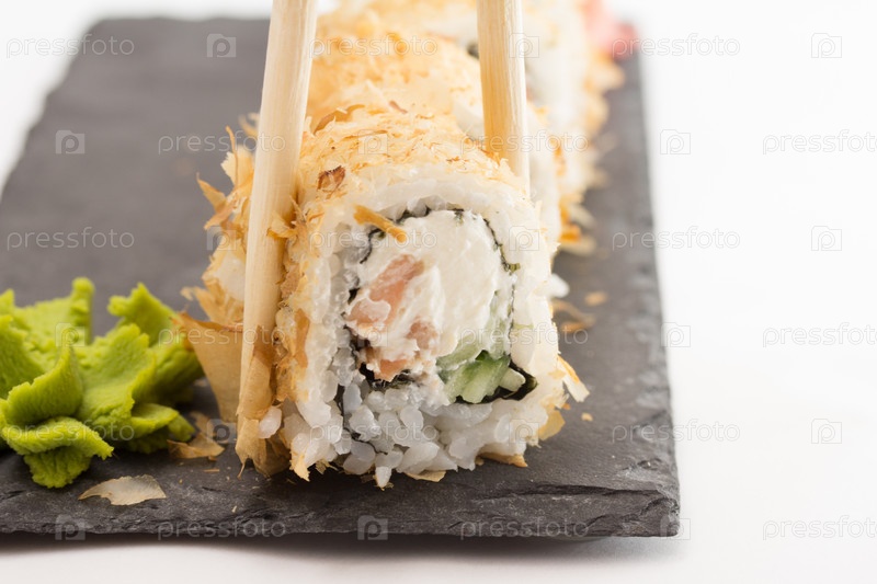 Суши-ролл на каменной тарелке, изолированные на белом фоне
