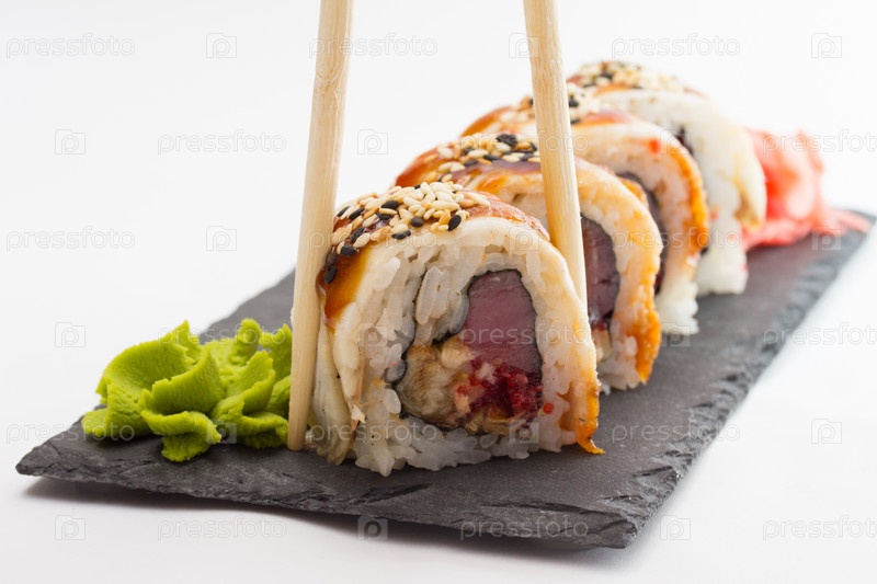 Суши-ролл на каменной тарелке, изолированные на белом фоне