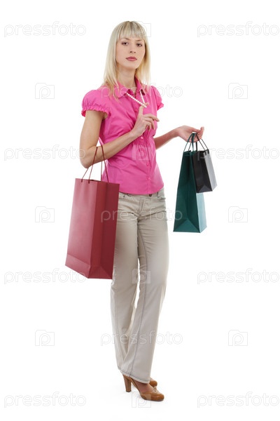 Девушка с пакетами на белом фоне