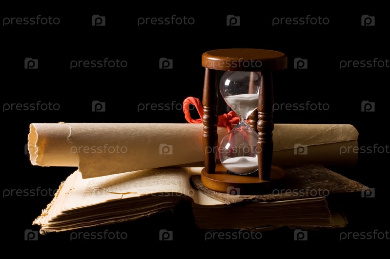 Песочные часы, старинная книга и свиток на черном фоне