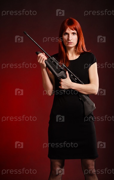 Молодая женщина в черном платье со снайперской винтовкой на красном фоне