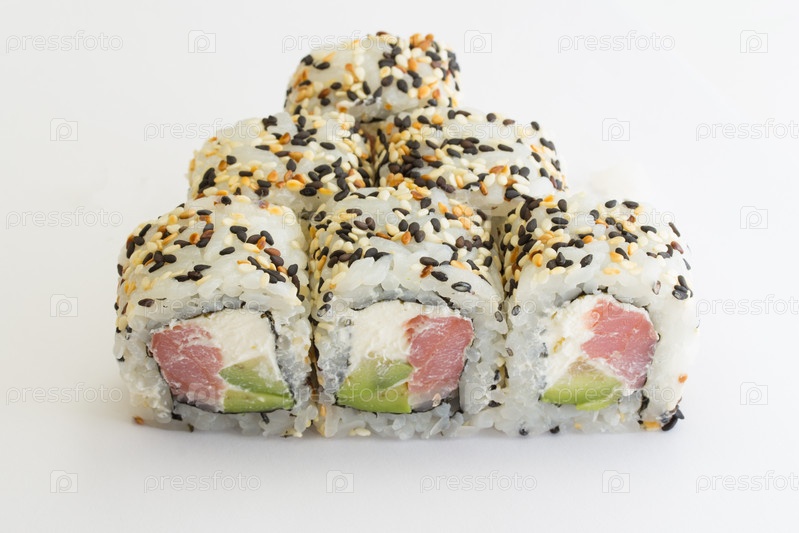 Суши-ролл с тунцом и кунжутом на белом фоне