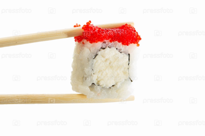 Суши-ролл с красной икрой на белом фоне