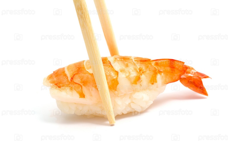 Суши нигири с креветками на белом фоне