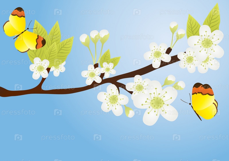 Желтые бабочки у ветки с белыми цветами на голубом фоне