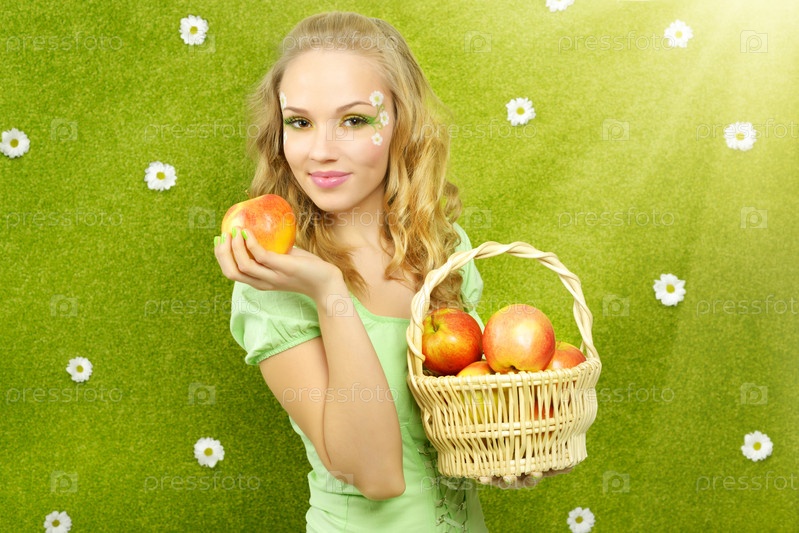 Привлекательная девушка с корзиной яблок