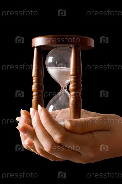 Песочные часы в руках на черном фоне