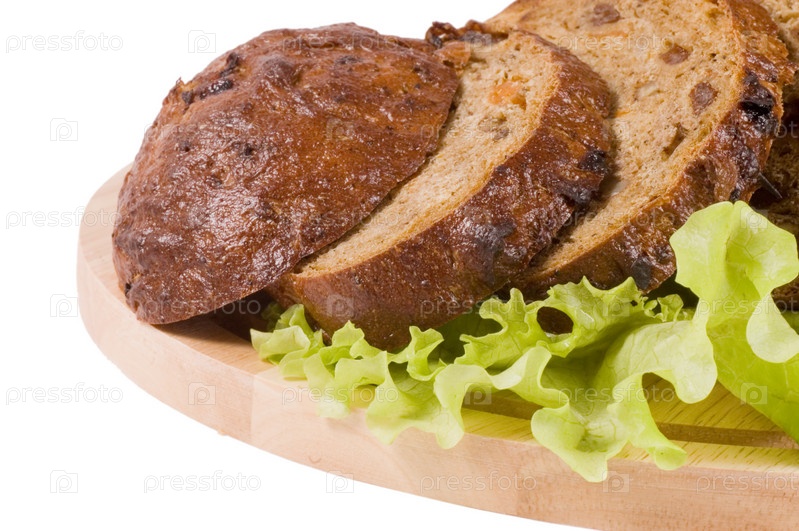 Свежий хлеб и лист салата на белом фоне