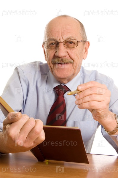 Пожилой бизнесмен делает записи в блокноте