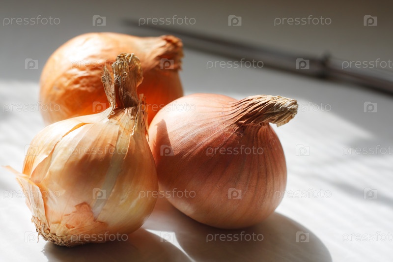 Три луковицы лежат на кухонном столе