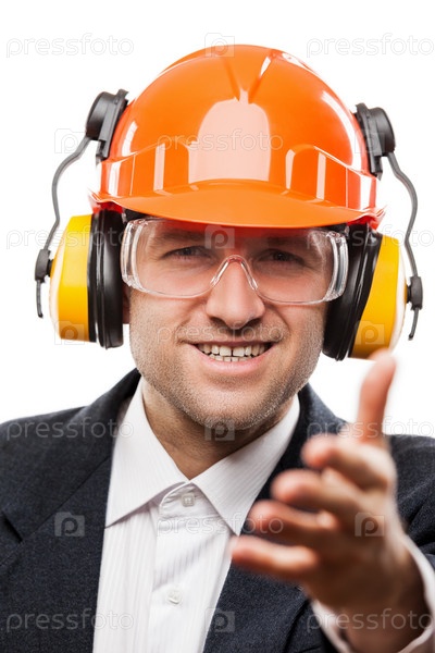 Бизнесмен в шлеме с приветственным жестом