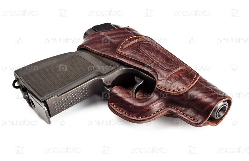 Винтажный пистолет в кожаной кобуре изолирован на белом