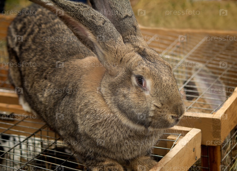 Большой серый кролик на клетке