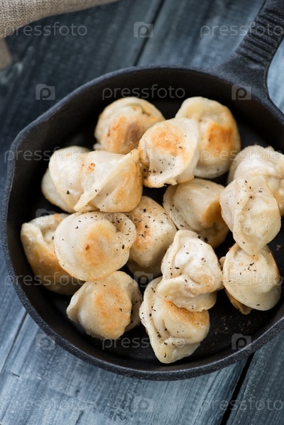 Жареные пельмени в сковороде, вид сверху, крупным планом