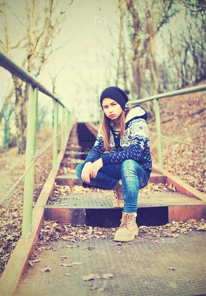 Одинокая девушка-подросток в шапке сидит на лестнице