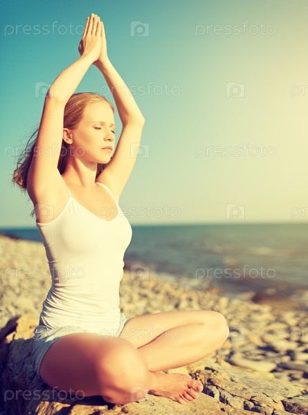Женщина медитирует на пляже