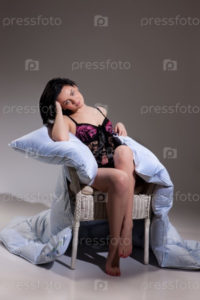 Молодая красивая женщина в кресле с пуховым одеялом