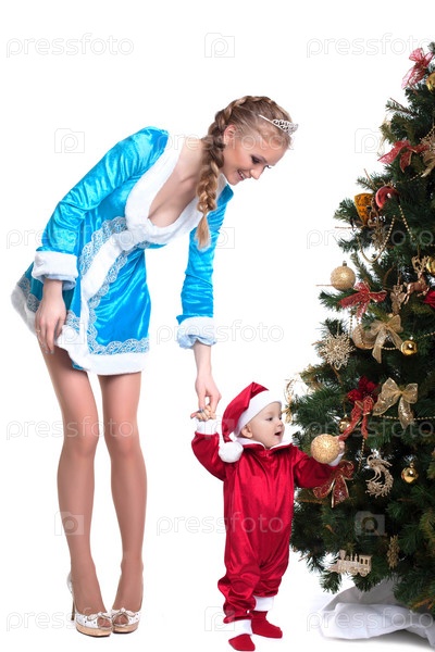 Мать в костюме снегурочки и ребенок в костюме Санта-Клауса