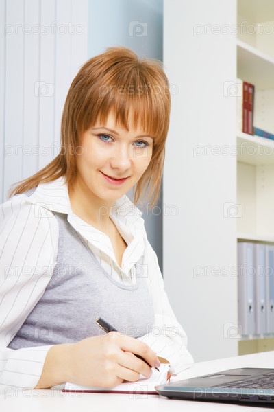 Портрет привлекательной девушки с ноутбуком в офисе