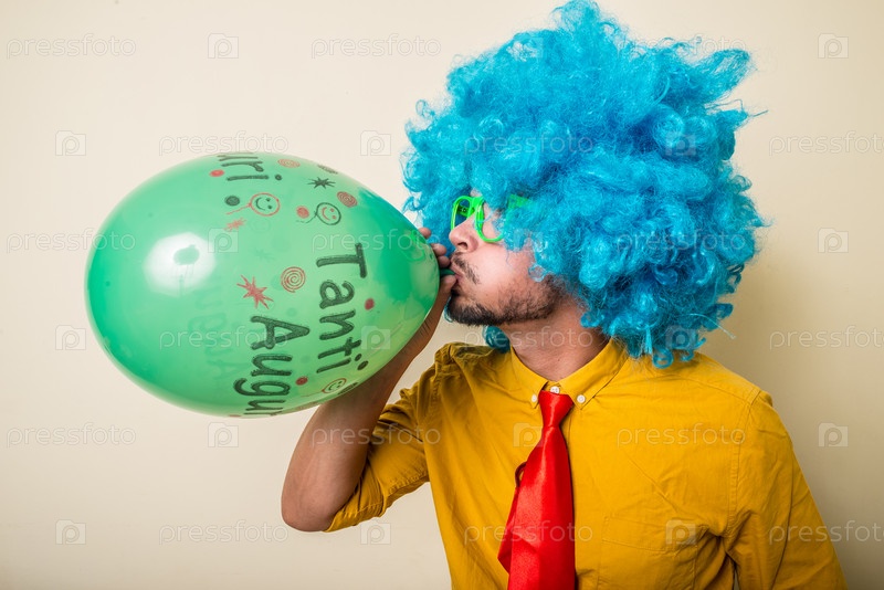 Забавный молодой человек в голубом парике