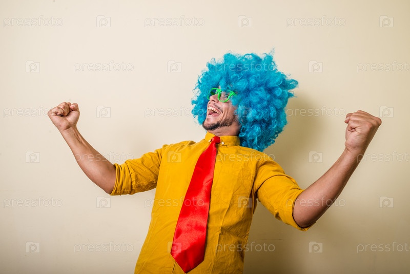 Забавный молодой человек в голубом парике