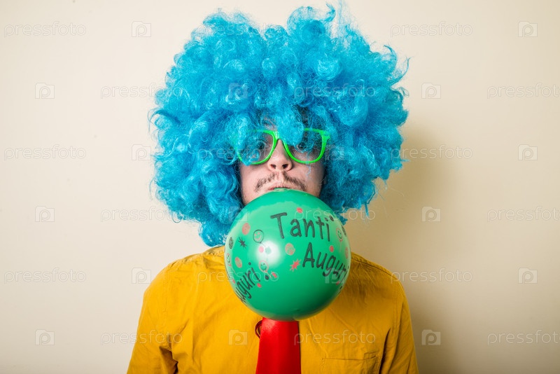 Забавный молодой человек в голубом парике