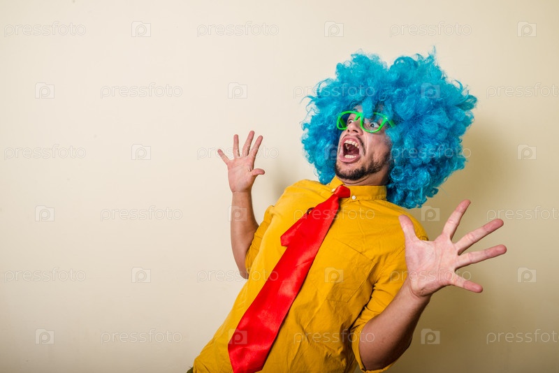 Забавный молодой человек в голубом парике