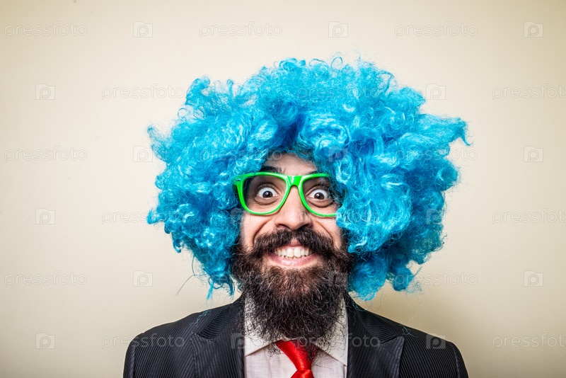Смешной бородатый мужчина в синем парике