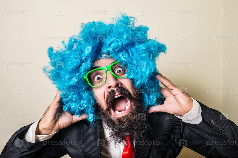 Смешной бородатый мужчина в синем парике