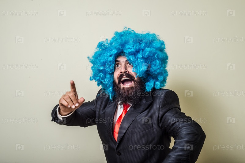 Смешной бородатый мужчина в синем парике
