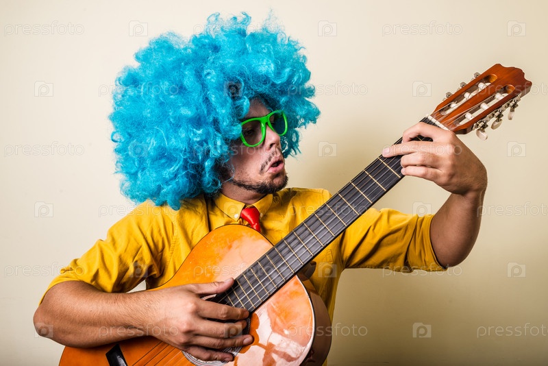 Забавный молодой человек в голубом парике