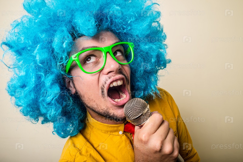 Забавный молодой человек в синем парике