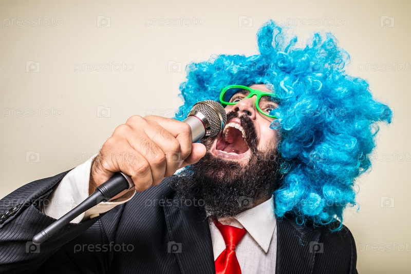 Смешной бородатый человек в голубом парике