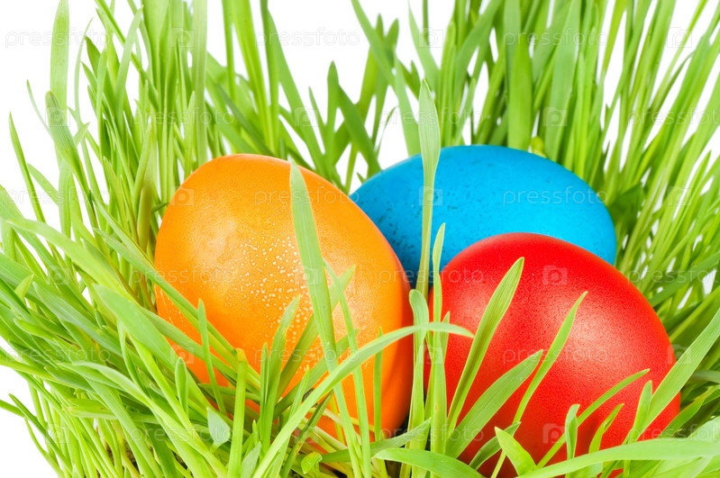 Пасхальные яйца в траве, изолированы на белом