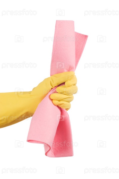 Рука в перчатке держит тряпку, изолирована на белом фоне