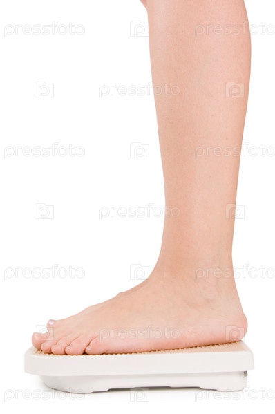 Женщина стоит на весах, крупный план, изолирована на белом
