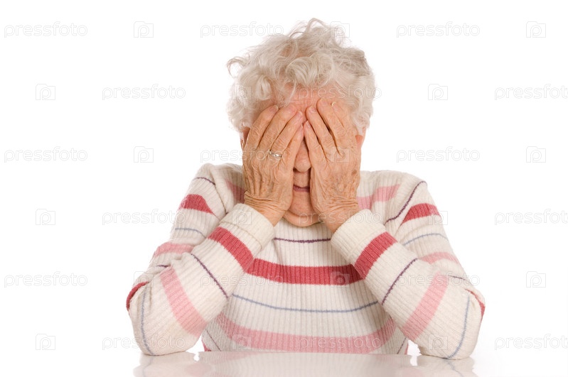 Портрет пожилой женщины, закрывшей руками лицо, изолирована на белом