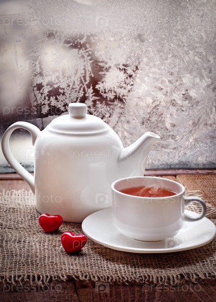 Чайная чашка, чайник и красные сердечки в морозный зимний день