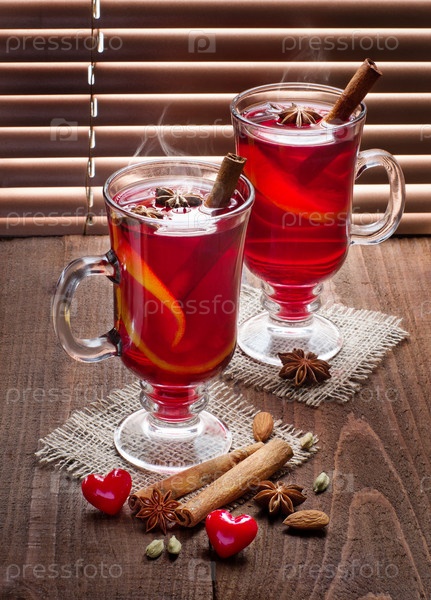 Два стакана глинтвейна на старом деревянном столе