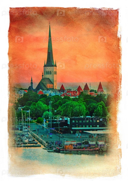 Живописный Таллин летним вечером, Эстония. Эффект старой открытки
