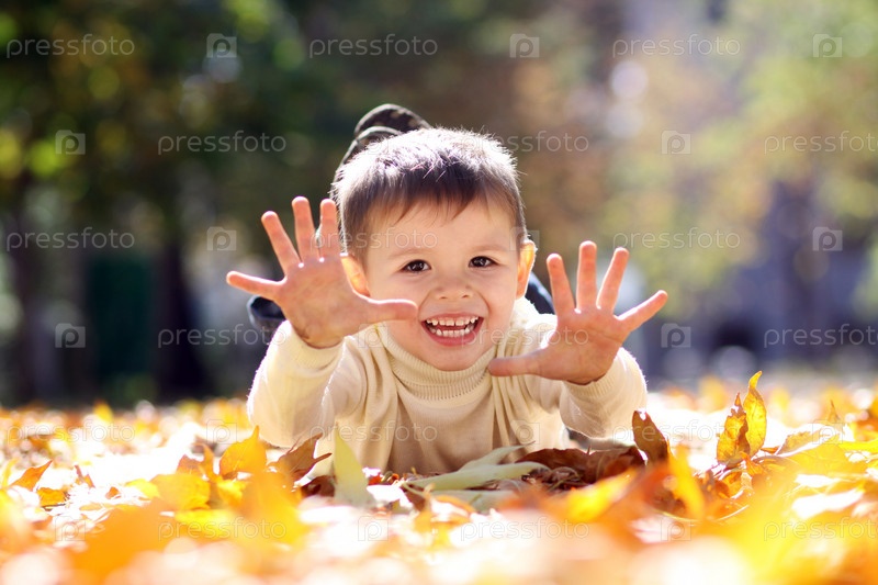 Мальчик лежит на осенних листьях
