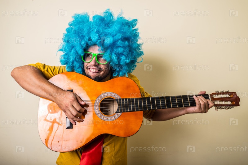 Сумасшедший забавный молодой мужчина в голубом парике