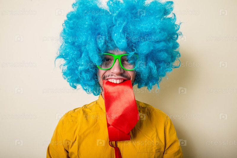 Сумасшедший забавный молодой мужчина в голубом парике