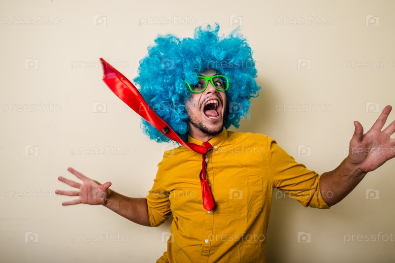 Сумасшедший забавный молодой мужчина в голубом парике