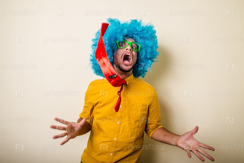 Сумасшедший забавный молодой мужчина в голубом парике