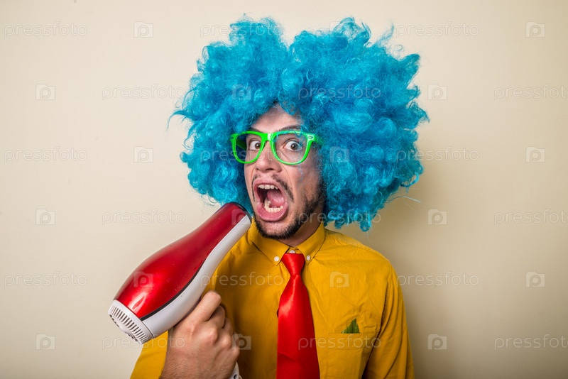 Забавный молодой человек в голубом парике