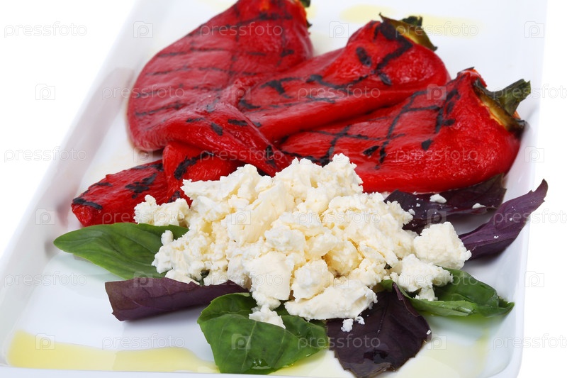 Блюдо из сыра, красного сладкого перца и зелени крупным планом на белом фоне