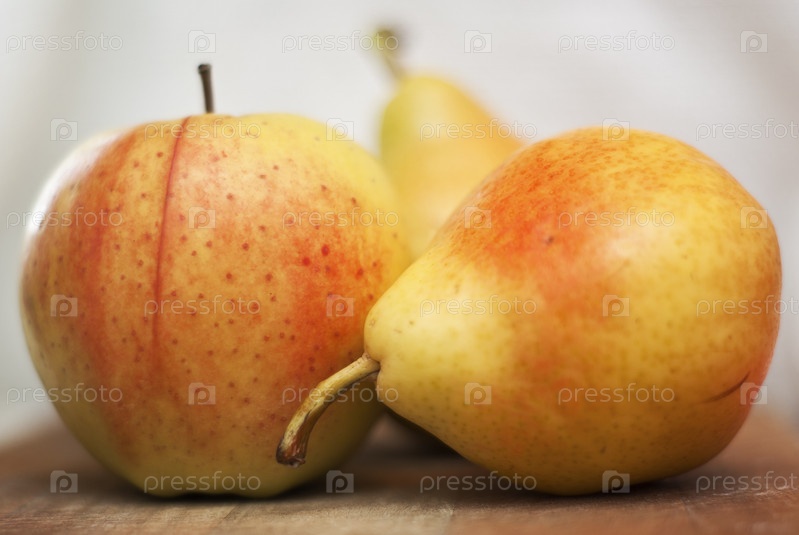 Спелые груши и яблоко крупным планом на столе